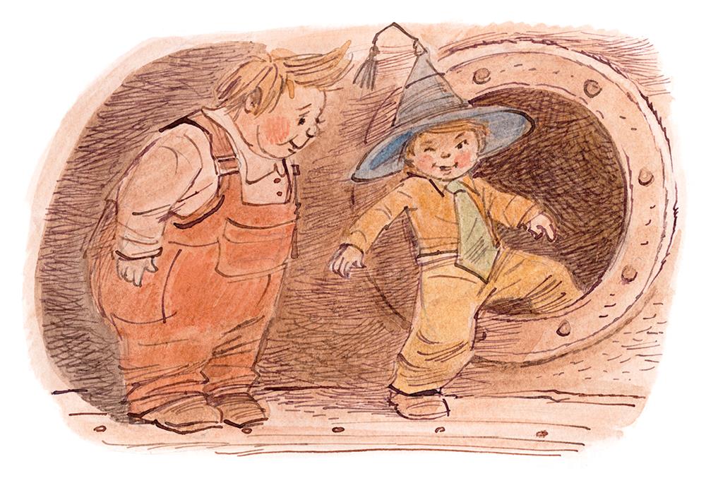 Пончик вылез из лифта и увидел, что очутился в узеньком, кривом коридорчике, который как бы кольцом огибал шахту лифта. Пройдя по коридорчику, Незнайка остановился у круглой металлической дверцы, которая напоминала дверцу пароходной топки.
