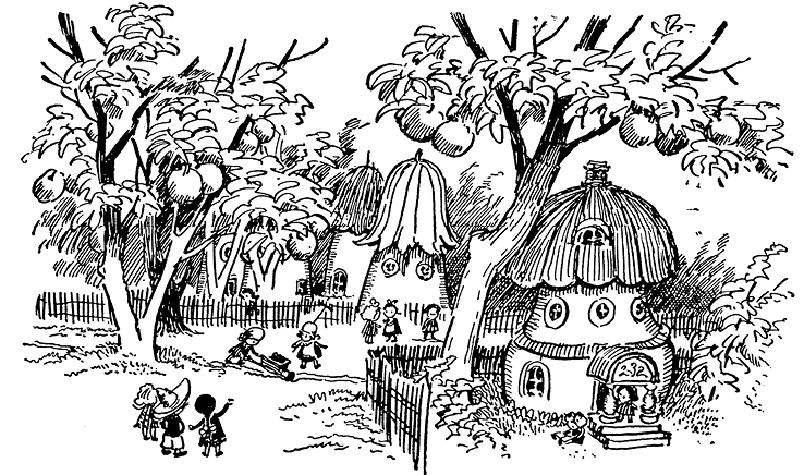 Снежинка и Синеглазка вышли с Незнайкой на улицу, по обеим сторонам которой тянулись заборчики, плетённые из тонких ивовых прутьев. За заборчиками виднелись красивые домики с красными и зелёными крышами. Над домами возвышались огромные яблони, груши и сливы. Деревья росли и во дворах и на улицах. Весь город утопал в зелени деревьев и поэтому назывался Зелёным городом.