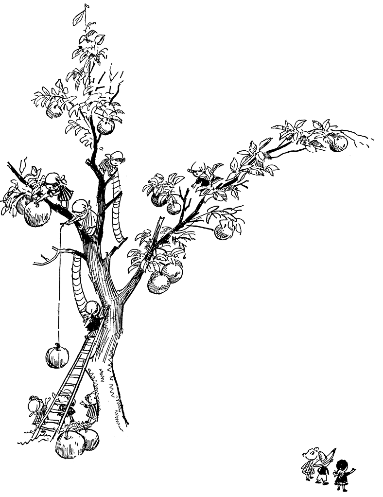 В это время они проходили мимо яблони, которая росла посреди улицы. Все ветви яблони были усыпаны спелыми, красными яблоками. Снизу к яблоне была приставлена высокая деревянная лестница, которая доставала только до середины её огромного ствола. Дальше кверху вела верёвочная лестница, которая была привязана к нижней ветке дерева. На этой ветке сидели две малышки. Одна малышка старательно перепиливала пилой черенок яблока, другая малышка заботливо поддерживала рукой первую, чтобы она не свалилась вниз.