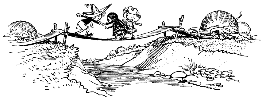 Синеглазка взошла на мост и зашагала на другую сторону. Незнайка тоже смело взошёл на мост, но тут же остановился, так как почувствовал, что мост под ногами качается.