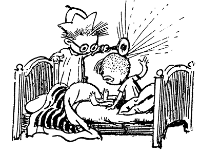 Ворчун нехотя приподнялся и сел на постели, тупо глядя прямо перед собой. Незнайка приложил к его груди деревянную трубочку и сказал: