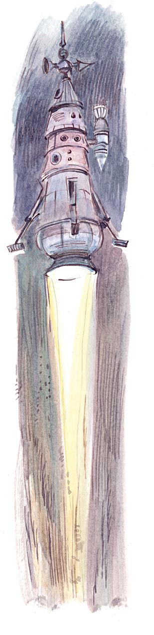 Если бы кто-нибудь из обитателей Космического городка в эту минуту проснулся и выглянул в окно, то был бы до крайности удивлён, увидев, как ракета медленно отделилась от земли и плавно поднялась в воздух. Это произошло почти бесшумно. Из нижнего сопла двигателя с лёгким шипением вырывалась тонкая струя нагретых газов. Реактивной силы от этой струи было достаточно, чтобы сообщить ракете поступательное движение, так как благодаря наличию прибора невесомости сама ракета ровным счётом ничего не весила.