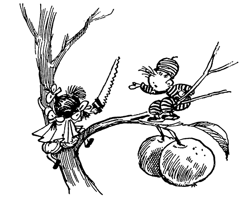 Синеглазка сбегала в соседний дом и принесла Торопыжке пилу. Через минуту черенок был перепилен, и яблоко полетело вниз.