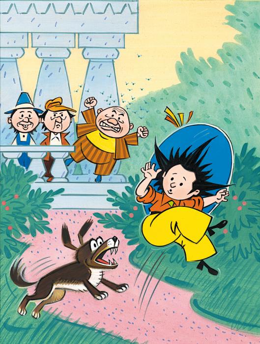 Увидев, что дело начинает принимать совсем нежелательный оборот, Незнайка со всех ног побежал прочь. В это же время Фекс отвязал цепь, и кудлатый пёс ринулся за Незнайкой.