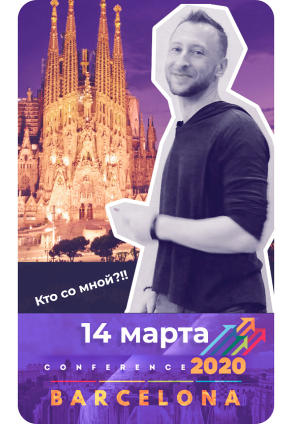 Я тут же нашёл и вырезал фото себя из одного из своих недавних снимков, и подыскал в интернете вид – наверно, самого узнаваемого символа Барселоны – собора авторства Антонио Гауди. Из всех снимков мне больше всего понравился этот храм на фоне ночи – он выглядел завораживающе сказочным – его-то я и выбрал. Дата конференции была известна, 14 марта, поэтому её я тоже добавил на свой «плакат желаний», подписав ниже призыв: «Кто со мной?»
