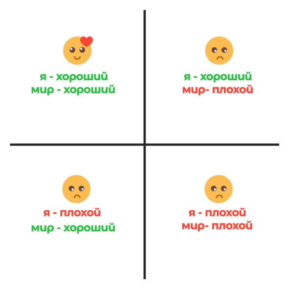Так и выглядит этот квадрант: я – хороший/плохой. Мир – хороший/плохой.