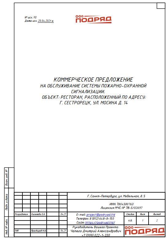Коммерческое предложение для такого клиента будет состоять из титульного листа, в левом верхнем углу которого указывается номер исходящего (он же номер клиента, берется из CRM, он же номер папки) и дата разработки КП. Ниже указывается название коммерческого предложения (на обслуживание автоматической пожарной сигнализации) – эта информация берется из комментариев в карточки клиента, там указывается с какой задачей к нам обратился клиент. Далее указывается назначение объекта (данная информация берется из карточки клиента, графа «назначение объекта»), ниже указывается адрес объекта. Обратите внимание, что вся информация указываемая в коммерческом предложении выполнена шрифтом GOST Common (курсив), все выполнено аккуратно, ровно, параллельно и перпендикулярно. Ниже указывается стандартная информация, которая не меняется: это адрес нашего офиса, ИНН нашей компании, лицензия МЧС, e-mail, телефон, сайт. Информация о руководителе проекта берется из карточки клиента, графа «ответственный», на данный момент – это Чапего Дмитрий Александрович, но в дальнейшем при росте компании будут появляться новые сотрудники. После составления коммерческого предложения, нужно проверить общее количество листов и указать их количество на титульном листе в колонке «листов». В строке «Разработал» указываете себя, в строке ГИП указываете Просвирова Н.О. На следующей странице представлен образец титульного листа коммерческого предложения. Титульный лист обязателен для всех коммерческих предложений, для любого типа клиента. У каждого коммерческого предложения есть титульный лист.
