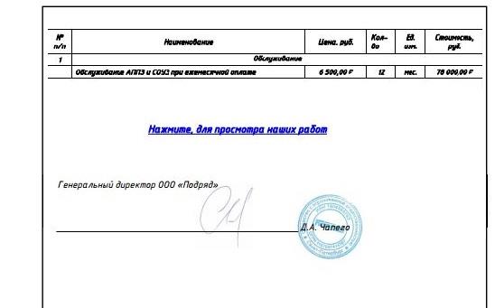 Вторым блоком идет само предложение, в котором отображается наименование услуги, цена за единицу, количество, ед. измерения и общая стоимость. Например Обслуживание АПС, 6500р в месяц, количество месяцев – 12, общая стоимость за год 70тр. Ниже идет гиперссылка на примеры наших работ и подпись ген. директора с печатью.