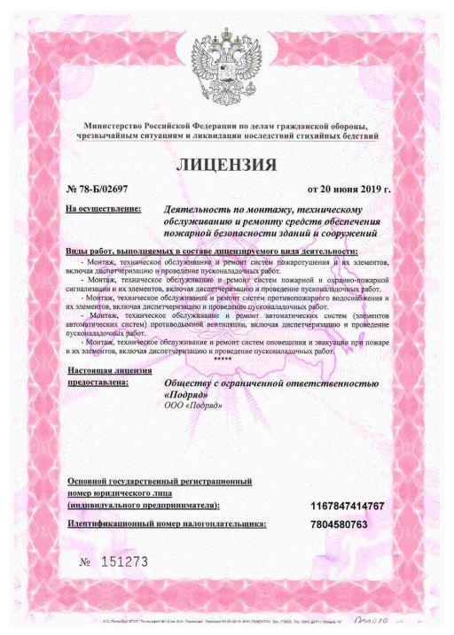 Следующим блоком идут лицензии нашей компании, они прикрепляются ко всем коммерческим предложениям, выставленным от компании «Подряд» касающихся систем пожарной безопасности, по очередности идут последним блоком. Лицензия не прикладывается, если речь идет о поставке оборудования или производстве работ по другим направлениям слаботочных систем, например: системы контроля и управления доступом, системы видеонаблюдения, системы диспетчеризации, системы охранной сигнализации, структурированные кабельные сети (интернет) – данные работы не требуют обязательного лицензирования по законодательству нашей страны.