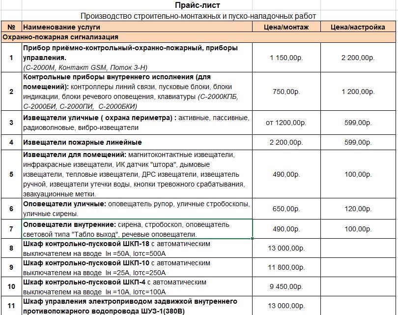 Следующим шагом, нужно указать цены в колонке «стоимость работ», тут немного сложнее. Информация для таких работ берется из файла «Прайс лист СМР ПНР» который расположен на общем диске в директории: 3 отдел продаж/Прайс лист СМР ПНР. В данном файле указаны типовые работы.