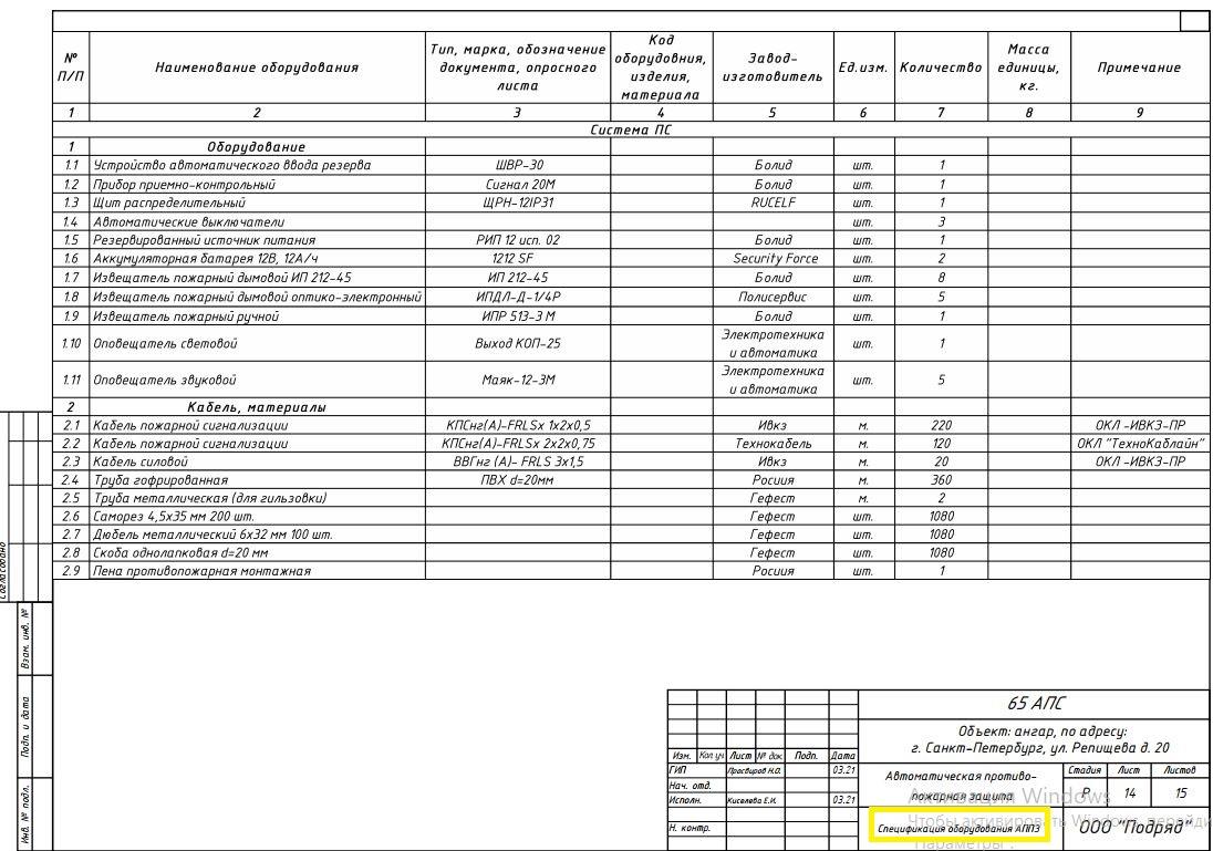 Бывает, что в качестве исходных данных вместо такой таблицы нам направляют проектную документацию. В состав проектной документации входит спецификация (находится в конце проекта), в которой указан полный перечень оборудования и материалов необходимый для реализации данного проекта.