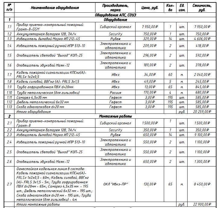 – если речь идет о системе пожарной безопасности, тогда в ней обязательно (по нормативным документам) должна быть применена огнестойкая кабельная линия, в состав которой входят составляющие (например, металлический дюбель, саморез, кабель, гофрированная ПВХ труба), мы не пишем отдельно монтаж кабеля, монтаж гофрированной трубы, монтаж дюбеля, монтаж самореза, потому что это все одно целое. Специалисты нашей профессии считают монтаж огнестойкой кабельной линии (в полном составе) за 1 метр;