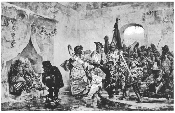 После обеда гости, разгоряченные напитками, стали исполнять национальные пляски. Потешив императрицу и придворных, свадебный кортеж двинулся к Ледяному дому, освещенному фонтанами, извергавшимися из хобота слона и пасти дельфинов.