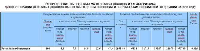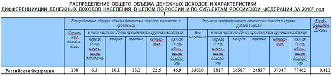 Как видим, этот коэффициент, который подтверждает то, что большинство населения и так знает, свидетельствует, что доходы в стране распределяются не так, как пытается представить нам государственная статистика. Коэффициенты, которые публикуются Аналитическим Центром при Правительстве РФ, служат больше пропаганде якобы цивилизованности в распределении доходов, чем отражают реальную действительность. Коэффициент 0,649, который выводится из статистики за 2017 г., ближе к 1, чем к 0, больше сближает Россию с ЮАР, чем с Европой, свидетельствует о том, что в стране процветает неравноправие в распределении доходов и богатства, об отсутствии стимулов для роста производства и отсутствии потенциала (из-за низкой покупательной способности) для развития рынка. При этом надо учесть, что мы не приняли во внимание многомиллионной армии безработных или частично занятых, перебивающихся случайными заработками. Ведь это благодаря им (точнее их отсутствию в списке занятых) поднимается планка среднемесячных доходов промежуточной группы между бедными и богатыми.