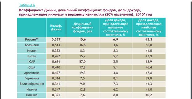 Как видим, доля доходов, принадлежащих наиболее состоятельной 20%-ной доле населения в России, чуть уступает доле в США, Бразилии, Аргентине, что может быть и так, поскольку по числу долларовых миллиардеров на 100 млн. населения Россия в числе лидеров, но по количеству долларов уступает США. О «цивилизованном» распределении доходов свидетельствует и коэффициент Джини Росстата: он изменился от 0,415 до 0,411; т.е. очевидна тенденция от менее справедливого к более справедливому. Поясню, что К=0,0 – это наиболее справедливое распределение всем поровну, К=1,0 – это когда наиболее богатый (или состоятельная группа) забирает себе всё, оставляя «на бобах» всё остальное население. Правда, если смотреть данные официальной статистики и Аналитического Центра при Правительстве РФ, то несложно заметить, что они всё время разнятся. Кроме того, отметим, что в таблице № 4 мы видим на 2015 г. децильный коэффициент (10%) Джини 0,413, а в таблице № 6 (того же отчета) – квинтильный коэффициент (20%) – 0,377. Отсюда делаем вывод: чем больше дробится целое, тем точнее результат и хуже (для чиновников) отчетные показатели.