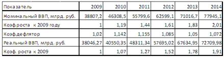 Известно, что за период с 2009 г. по 2014 г. номинальный ВВП вырос с 38807,2млрд.р. до 70975,6 млрд.р. (в обновленной версии Росстата было уже 71406,4 млрд. руб., потом оказалось – 77945,1 млрд. руб. – только успевай исправлять таблицы, но принципиального значения это для нашего анализа не имеет). Итак, смотрим, как рос ВВП: