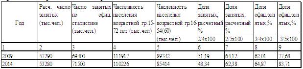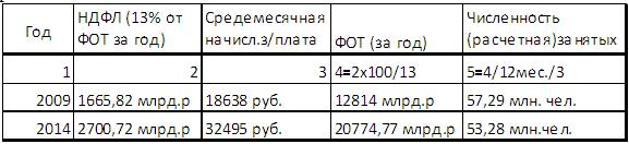 Отметим, что официальные данные по занятым таковы: в 2009 г. – 69,4 млн., а в 2014 г. – 71,5 млн.человек. Как видим, расчетная (по среднемесячной зарплате) численность занятых в экономике не соответствует официальной статистике. Либо среднемесячная заработная плата значительно ниже (официальное значение завышено путём группировки тех, чьи доходы исчисляются миллионами, вместе с теми, кто получает меньше МРОТ, что искажает реальное денежное обеспечение населения; Все понимают, что средняя зарплата в стране формируется путем сложения таких должностей, как генеральный или технический директор, начальник финансово-экономической службы /от 300 до 825 тысяч, особенно высокооплачиваемые должности в нефтегазовой сфере/, таких рабочих профессий, как электросварщик, шахтер, электромонтер /от 16 до 40 тысяч рублей/ и значительного числа тех, кто получает до 16 тысяч рублей. При росте зарплаты только у директоров, равно как и при сокращении численности низкооплачиваемых рабочих, статистика будет фиксировать рост средней), либо занятых значительно меньше. Возможно, 53,28 млн. человек – это и есть среднесписочный состав рабочей силы, т.е. реально занятые. При этом очевидна тенденция к снижению занятости. Чем же «заняты» 18,22 млн. человек? Учитывая контроль налоговой инспекции, я склонен считать расчеты по заработной плате более достоверной информацией, чем официальную статистику занятости. Отсюда: