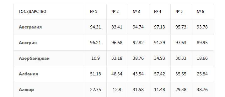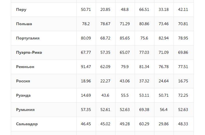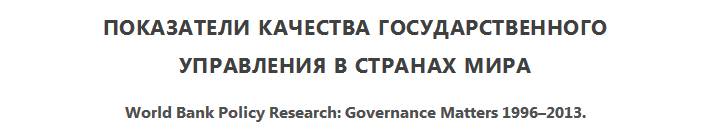 По показателям качества государственного управления Россия, если бы не по алфавиту, была бы в хвосте списка: чем меньше баллов, тем ближе к хвосту. При этом колонки: