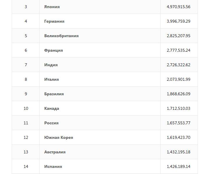 По размеру ВВП Россия оказалась на 11 месте – казалось бы неплохо. Но это – показатель в денежном выражении, где роль играет при отрицательном росте физического объема производства гарантированный рост на процент инфляции, как того требует монетаристская теория.