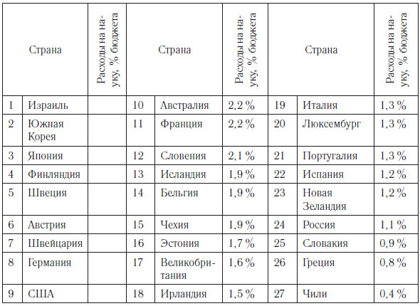 Таблица затрат на науку в различных странах из статьи: В. И. Левин. Проблемы науки в современной России // Личность и Культура. 2021. № 5.