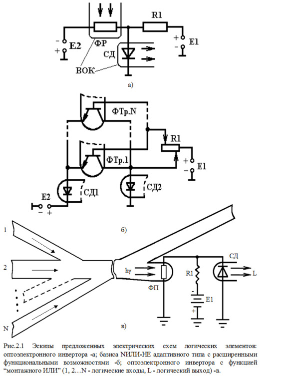 Для устранения их предложена схема ОЛЭ типа ОИ [47]. Ее отличие в том, что излучатель ОИ выполнен на основе СД, работающего в маломощном режиме, ФП – на ФР, ФТ, ФД с УФ на транзисторе и к нему может быть подключен маломощный дополнительный источник питания (ДИП) для усиления адаптивных свойств ФП (влияние ДИП на работу ОЛЭ заключается в задании напряжения смещения относительно общего провода одного из выводов ФП, см. подр. 2.2). Схема ОИ приведена на рис.2.1а с ФП на основе ФР, ее преимущества перед схемой ОИ [46] – излучатель на типовом СД, отсутствие жестких требований к значениям токов ІВкл. СД, возможность использования ФП разных типов и применение ДИП в их цепи. Схемы адаптивного типа PROS [48] (рис.2.1б), PROCOS [49] сочетают в себе схему n ИЛИ-НЕ (базис Пирса) с адаптивными ФП и имеют расширенные функциональные возможности.