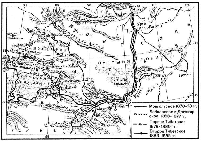 Пространство Центральной Азии, в котором совершались путешествия Н. М. Пржевальского, расположено между 32 и 48° северной широты и 78 и 117° восточной долготы. С севера на юг оно тянется более 1000 километров и с запада на восток около 4000 километров. Направления маршрутов экспедиции Пржевальского на этом громадном пространстве составляют настоящую сеть. Его караваны прошли свыше 30 000 километров.