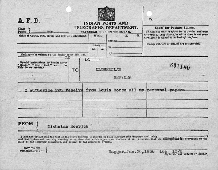 Телеграмма Н.К.Рериха адвокатам об отзыве личных документов у Л.Хорша от 20 января 1936 г.