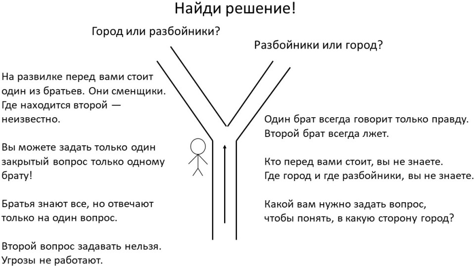 Вы идете по дороге, подходите к развилке. Одна дорога на развилке ведет к разбойникам, другая в город. Вам надо попасть в город, потому что разбойники вас убьют. На развилке поочередно стоят два стражника – два брата-близнеца. Причем самое интересное, что один из них на любой вопрос отвечает правдиво. Он говорит только правду. А вот второй брат наоборот (вот подлец!) в ответ на любой ваш вопрос лжет, то есть отвечает не так, как есть на самом деле. У него природой так заложено – дать неправильный ответ на любой вопрос. Вы не знаете, кто перед вами стоит – честный брат или лжец. У вас есть право на один-единственный закрытый вопрос только одному из братьев – тому, кто сейчас стоит на развилке. Закрытый вопрос – это вопрос, на который можно ответить «да» или «нет». Стражник отвечает на закрытый вопрос «да» или «нет» и замолкает. Больше он ничего не делает. Второй вопрос этому стражнику задавать нельзя. Другому стражнику тоже нельзя задавать вопросы. Какой только один закрытый вопрос надо задать только одному стражнику, чтобы наверняка понять, куда идти в город?