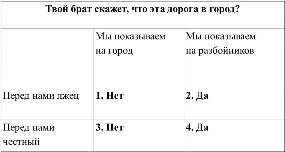 Вы знаете, а пятого не дано. Выходит, если вы слышите «да», вы показываете на разбойников. А когда вы слышите «нет», вы показываете на город, вне зависимости от того, кто перед вами стоит, лжец или честный брат.