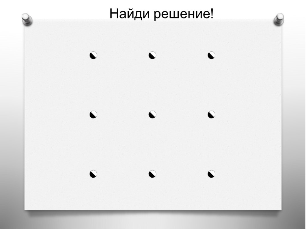 Перед вами квадрат из девяти точек. Вам необходимо пересечь все точки четырьмя линиями, не отрывая руки от листа и не проводя дважды по одной и той же линии (линии, разумеется, могут пересекаться).