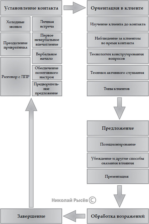 Итак, цикл продаж. Каждую продажу можно рассматривать с точки зрения цикла продаж. Цикл продаж – это схема, алгоритм, по которому мы все продаем, удивит это вас или нет, знаете вы это или нет. Есть вещи, которые существуют независимо от того, знаете ли вы о них. Цикл продаж – именно такая вещь. (Кстати, автору не перестает казаться, что сам термин «цикл продаж» придуман им самим.) Рекомендую посматривать на рисунок 4, когда будете читать нижеследующий текст.