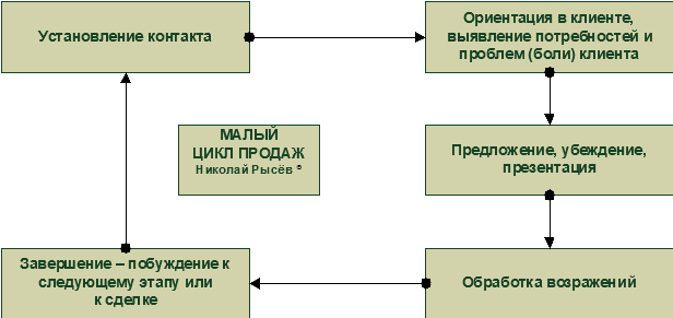 Я предлагаю два понятия: большой цикл продаж и малый цикл продаж. Чем они отличаются? Малый цикл продаж подходит для любого вида продажи, что бы мы ни взяли. Привлекаете ли вы клиента через ВКонтакте и Инстаграм, продаете вы в магазине бытовую технику или ведете переговоры с клиентом о приобретении программного продукта «Корпоративные финансы», разговариваете вы по телефону или сидите за столом переговоров, – в любом случае, вы вступаете в контакт, вы ориентируетесь в потребностях клиента, предлагаете ему, отвечаете на его возражения и побуждаете к принятию решения. Это универсальные этапы, для всех продавцов, на все времена. Это работало 2000 лет назад, работает сейчас, и будет актуальным через 5000 лет. Формы реализации этого малого цикла продаж, могут быть и будут разные, но вот, по сути, ничего не измениться!
