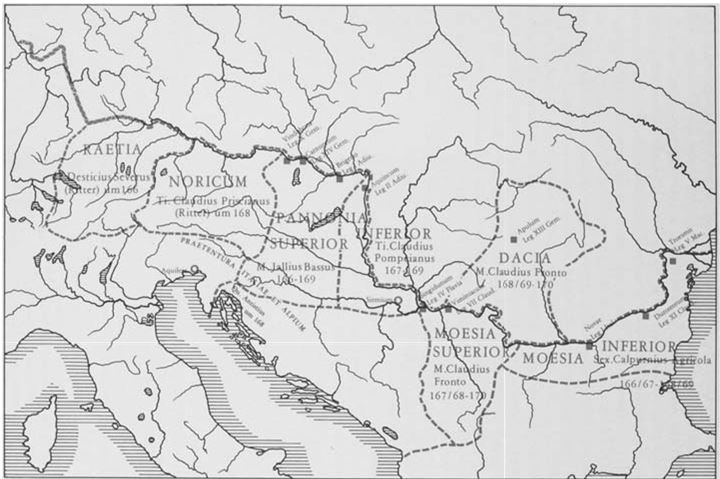 Римские дунайские провинции в начале Маркоманнских войн в 167/68 г. н. э. с информацией о наместниках и местах расположения легионов