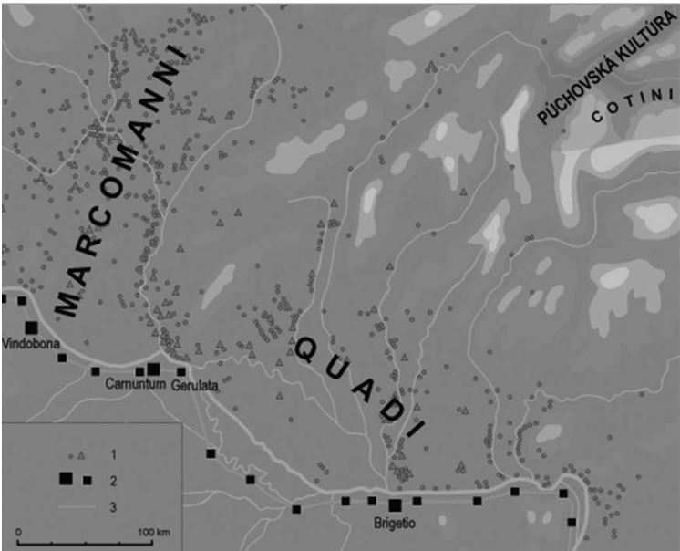 Но продвижение к среднему Дунаю, по-видимому, имело место не только из района Одера-Вислы, где в основном были представлены вандалы. Давление шло также из эльбской области Богемии, Саксонии и Бранденбурга, а также из Шлезвиг-Гольштейна и южной Дании. Картографирование римских мечей с кольцевыми набалдашниками и кольчуг в могилах германских воинов и жертвенных находках конца II и начала III веков, сделанное К. Раддацем, дает показательную картину в этом отношении. Это оружие, несомненно, является добычей Марко-манских войн, которую привезли германские ветераны войны, вернувшиеся домой и которая чуть позже была положена вместе с ними в могилы.