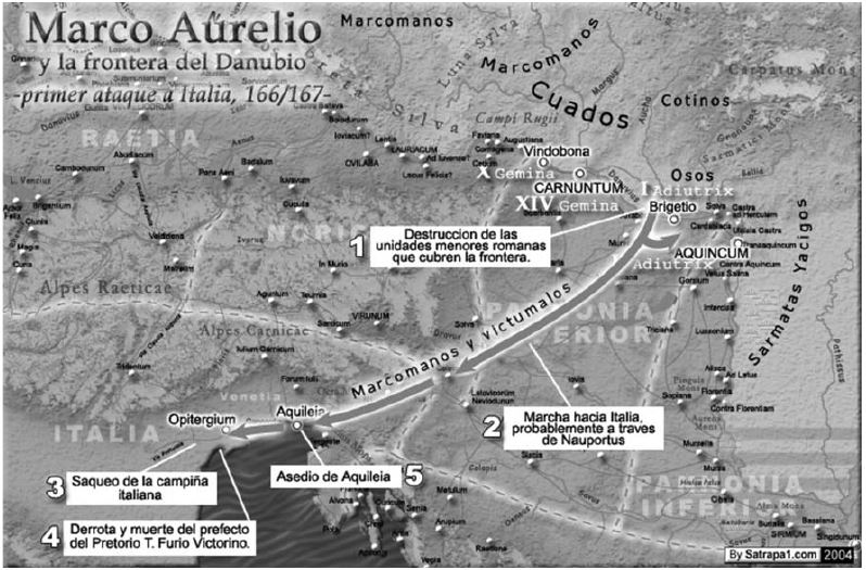 Главный удар был нанесён маркоманнами, квадами, лангобардами, виктуалами, гариями и некоторыми другими племенами по Верхней Паннонии. Огромная масса варваров, в основном германского происхождения, вломилась на территорию империи. Лимес был прорван, варвары заполонили Паннонию, лагеря римских войск были окружены, блокированы и частично уничтожены. Римское население Верхней Паннонии было частично истреблено, частично захвачено и уведено в плен, причём речь идёт о сотнях тысяч человек. После этого, часть варваров с семьями остались осваивать захваченную провинцию, а часть решила пойти дальше и двинулась по Янтарной дороге к Италии. Они прошли Саварию, Петовион, Целейю, Эмону и вышли к Аквилее, которую немедленно осадили. В Аквилее стояли новые легионы II Pia и III Concors, которые в обычных условиях наверняка разбили бы варваров, но теперь легионы были обескровлены чумой до такой степени, что даже не помышляли об открытом сражении и ограничивались обороной города. Тем более, что германцы и славяне II века были вооружены, оснащены и организованы куда лучше, чем 100 лет назад. Даже римские авторы признают, что варвары в Маркоманнских войнах были вооружены и организованы очень хорошо.