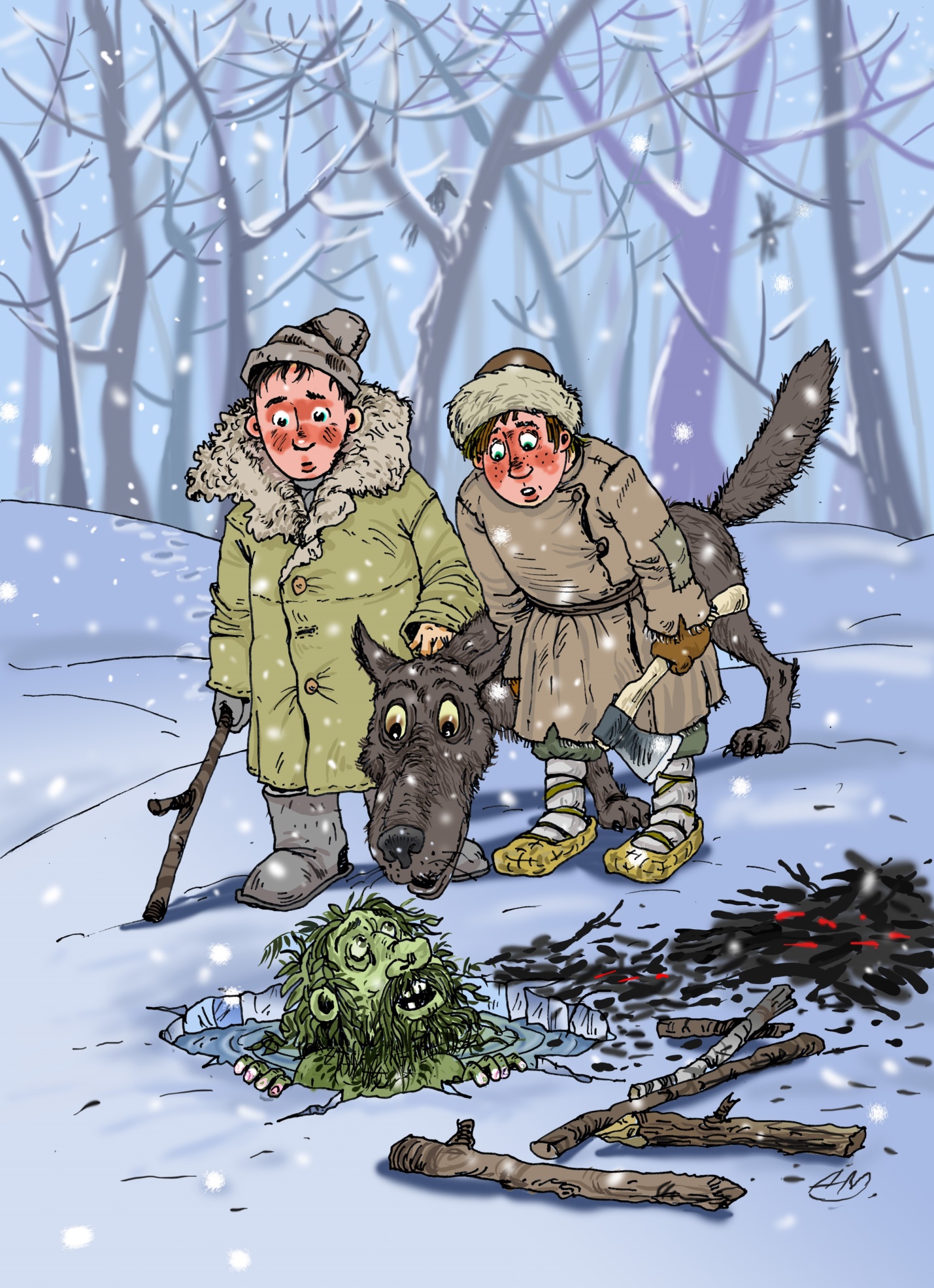 Едва волчище, высвободил хвост и отскочил от расширенной проруби, из неё высунулась любопытная голова водяного (зимой в подводном царстве скукота, и он был рад подвернувшемуся развлечению):