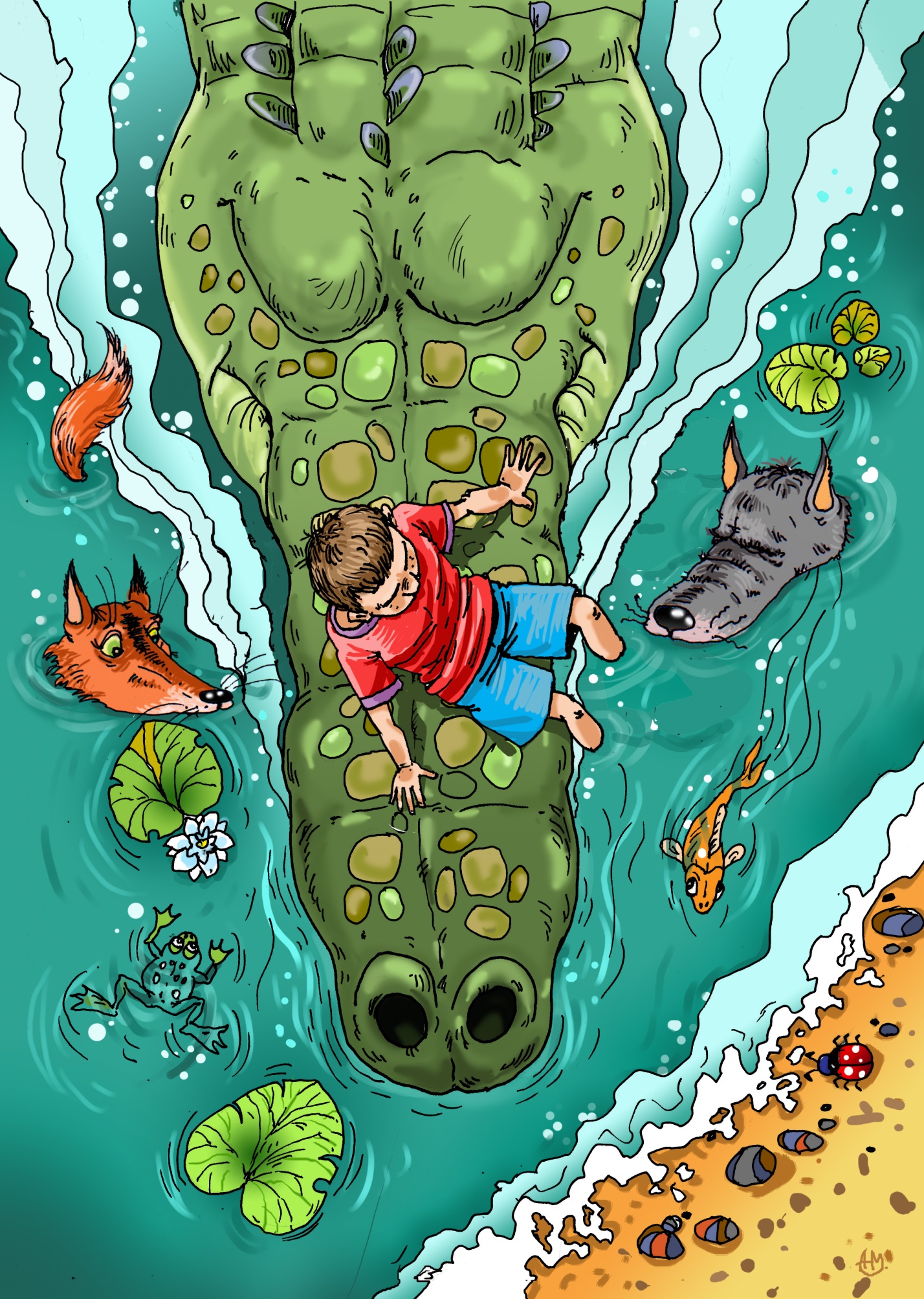 Дальше произошло самое интересное. Так как крокодил лежал на берегу реки, причём наклонно (головой вниз), все трое пленников вперемежку с мусором соскользнули в воду. Воду они не увидели, а лишь почувствовали, когда пришлось в ней барахтаться. Спрашивается почему? Да потому, что сначала было по-прежнему темно! Но потом стало светло, даже очень, от яркого света чуть глаза не ослепли. Вслед за Сашкой, мусором, волком и лисой выкатилось перепачканное до черноты солнце! В речке крокодилова грязь с него смылась, и солнце заблестело, как новенькое! Всё-таки Санька ошибался – в сказках и не такое случается.