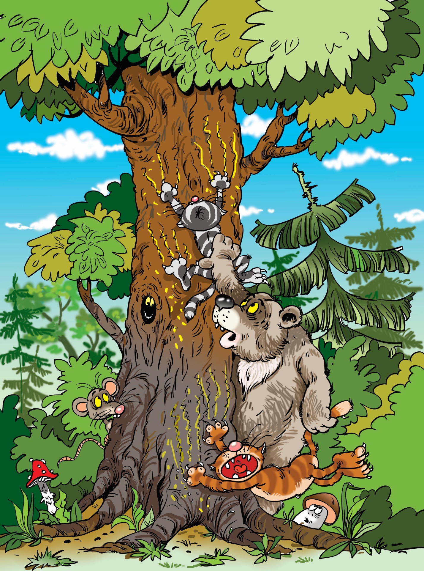 И побежала, толком не разъяснив. Медведь поймал двух кошек и полез. Но у кошек коготки – не то, что у медведя – не удержали. Свалился медведь и, обозленный, к мышке – возмущаться: