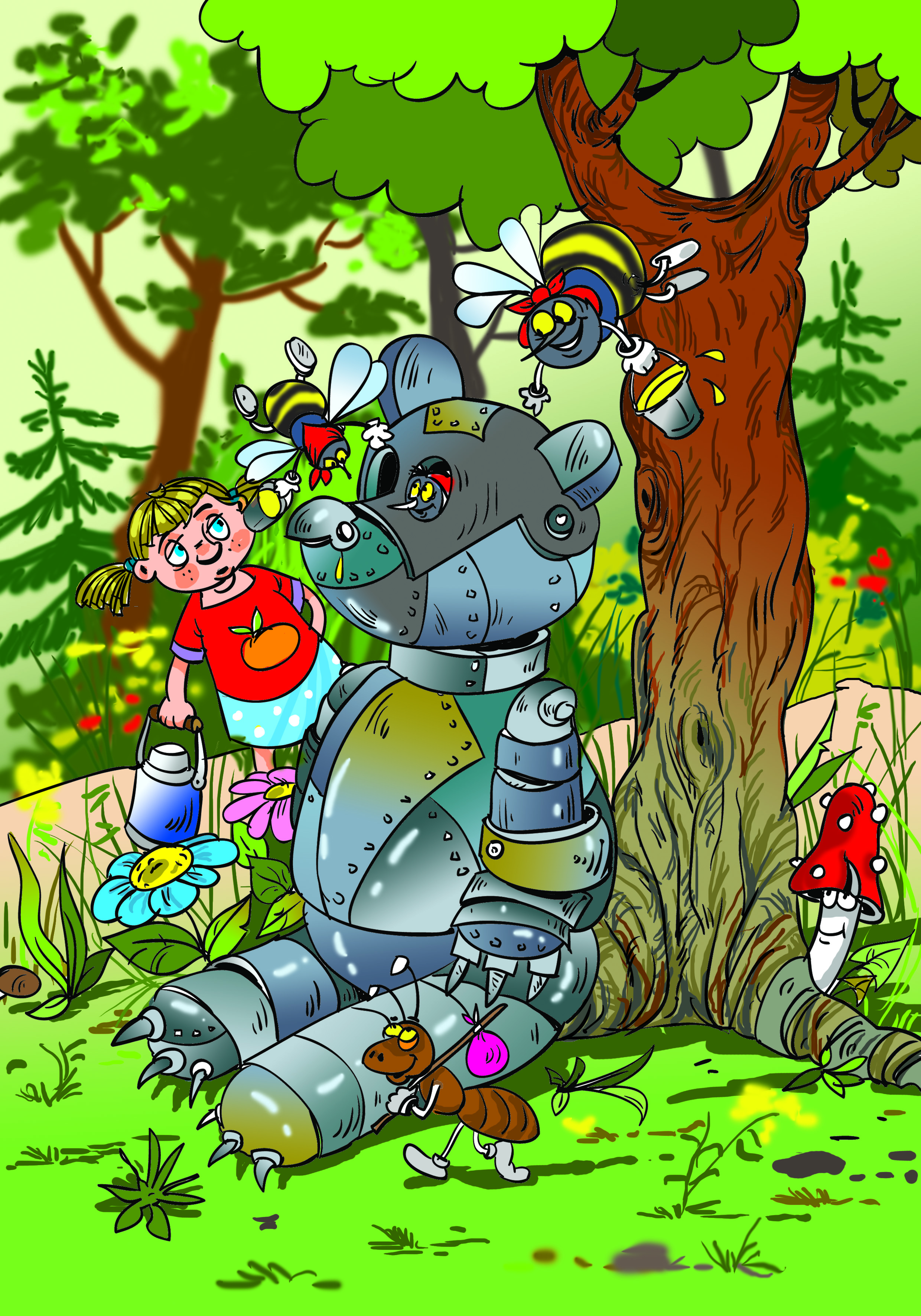 Только был у «мобильного улья» маленький секрет – дочка кузнеца иногда медком лакомилась. Приедет на велосипеде, нажмёт потайную кнопку, железная голова откинется – вот он мёд, бери да не зевай, ведь пчёлы, как известно, против. Но девчонку им не догнать. Так, что железный мишка уверен: велосипед – вещь полезная, без него не скроешься от погони.