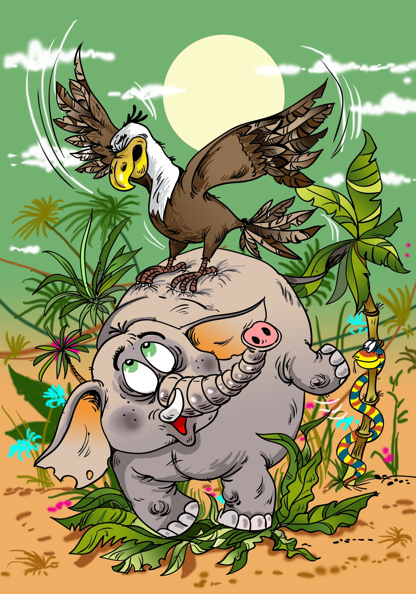 Змея же теперь частенько загорает на спине у слона. А в дырочку от когтя она втыкает зонтик, чтобы не сгореть.