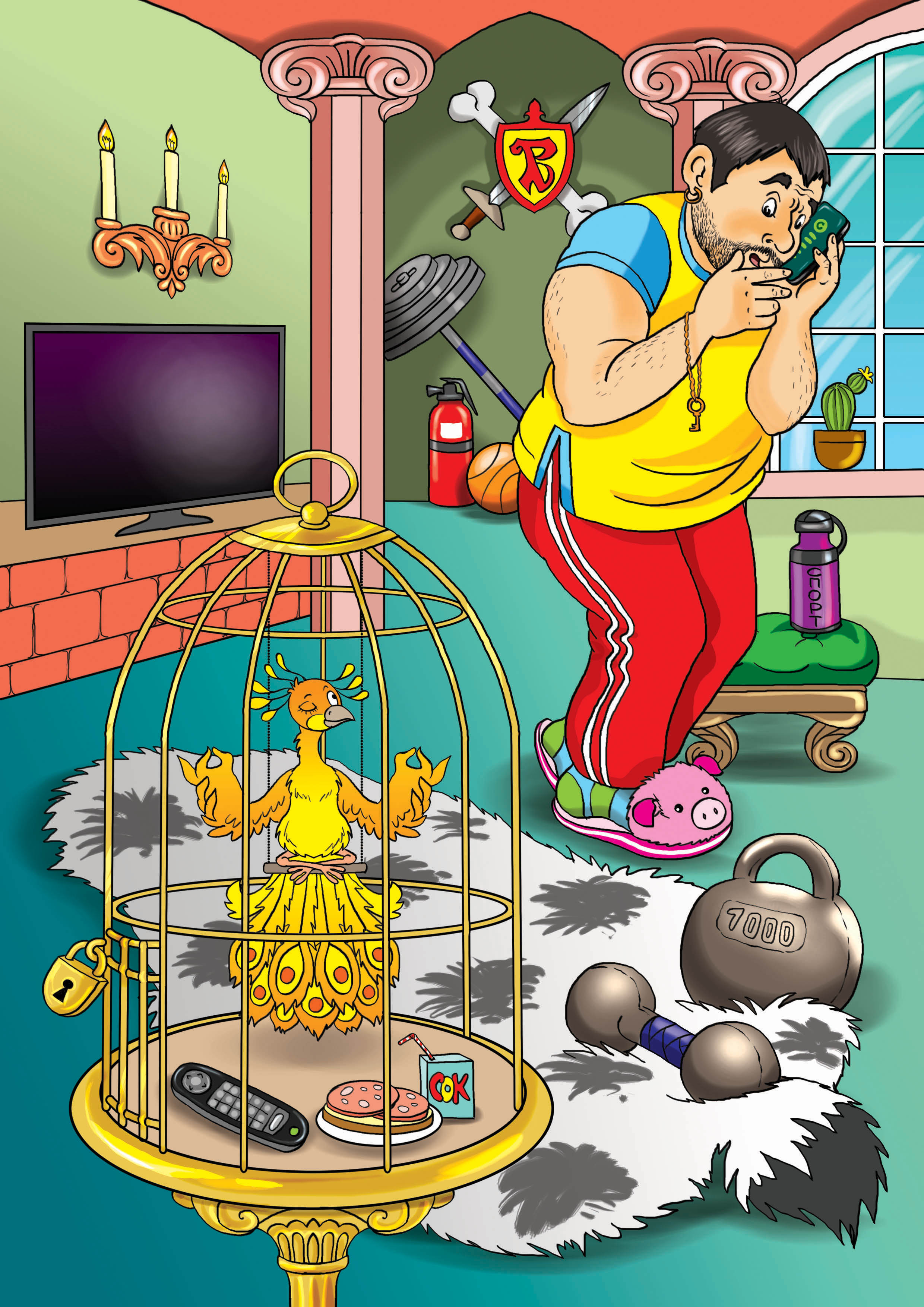 Настоящую золотую клетку Великан заказал гномам (лучше гномов никто не сделает). Когда хозяин замка оставался дома, Жар-птице позволялось размять крылья. Великан открывал дверцу золотым ключиком и выпускал пленницу полетать. Покидая замок, он запирал её в клетке и вручал пульт от телевизора, чтобы не скучала.