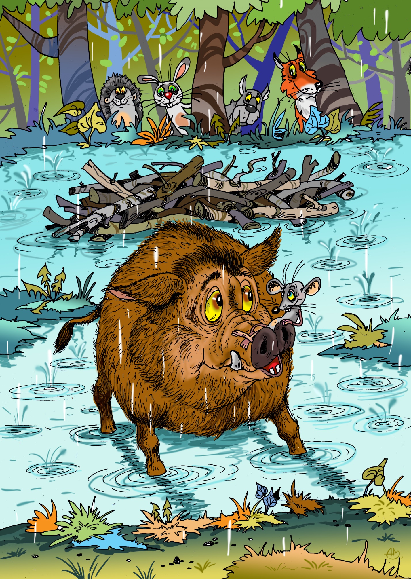 Лежит кабан, жалобно похрюкивает, да, как может, свою шкуру осматривает: не заползли ли из воды какие-нибудь переносчики микробов. И вдруг видит, прямо напротив его глаз отчаянно барахтается мышонок, совсем ещё маленький, и кричит:
