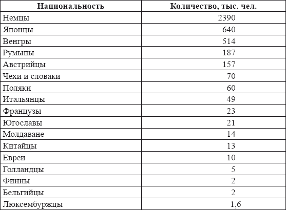 О точных статистических данных, в части количества, государственной и национальной принадлежности непосредственных убийц и палачей нашего народа говорить сложно – нет таких данных. Однако можно достоверно утверждать, что в уничтожении советских людей отметились практически все европейцы и даже некоторые азиаты. О данном факте можно судить по составу военнопленных, оказавшихся в СССР в результате войны (табл. 1).