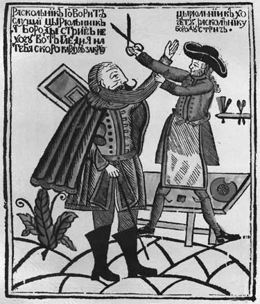 «Брадобритие, по понятию русских, было грехом. Сам Христос носил бороду, носили бороды и апостолы, бороду должны носить и все православные. Только еретики бреют бороду. Пётр, вернувшись из Европы, приказал насильно брить бороды и носить иноземное платье. У городских застав находились специальные соглядатаи, которые отрезали у прохожих и проезжих бороды и обрезывали полы у длинной национального покроя одежды. У сопротивлявшихся бороды просто вырывались с корнем».