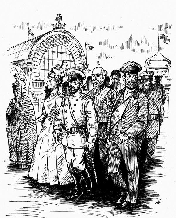 Государь, государыня и великий князь Алексей Александрович были встречены на подъезде Саввой Морозовым во главе ярмарочного комитета, а в Гербовом зале – министром финансов. Были представлены: царю – некоторые из наиболее выдающихся купцов, а царице – городские дамы. По витой лестнице гости спустились в Пассаж и обошли ряды купечества. Потом опять поднялись наверх и еще полчаса милостиво разговаривали с избранными в Гербовом зале. Тут между торгово-промышленными людьми странным образом оказались и некоторые дворяне, пропущенные все тем же Приклонским. Лыков стоял в углу и наблюдал, как решаются дела. Потные, красные от напряжения, люди что-то говорили государю и совали бумаги. Он терпеливо выслушивал, а прошения передавал министру Двора.