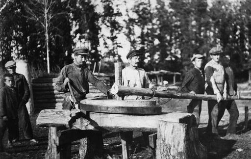 На краю поляны стояли несколько срубов, покрытых дранкой. Дядя Мурга остановил лошадей у самого большого сруба с окнами. Пока дедушка и дядя Мурга беседовали с рабочими, Антон показал мне всё, что было на поляне, и рассказал, как делаются деревянные колёса.