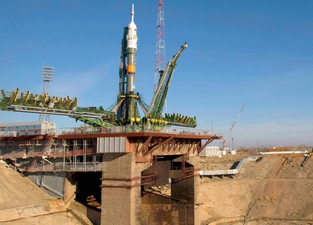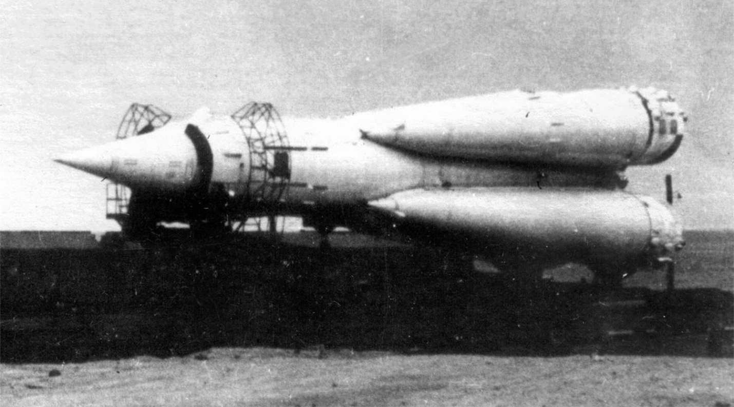 Л.Матвеев среди сослуживцев у памятника в честь запуска первой в мире межконтинентальной баллистической ракеты Р-7 на космодроме Байконур.
