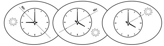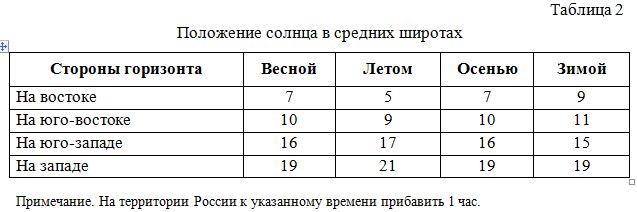Пример положения Солнца в средних широтах (в часах по местному времени) показан в табл. 2.