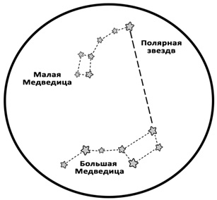 Полярная звезда – последняя в «ручке ковша» созвездия Малая Медведица – всегда указывает на север (рис. 16). Отыскать ее можно, мысленно продолжив линию, соединяющую две крайние звезды в ковше созвездия Большая Медведица и отложив на ней пять отрезков, примерно равных расстоянию между этими звездами. Точность определения этим способом может достигать 3…4°.