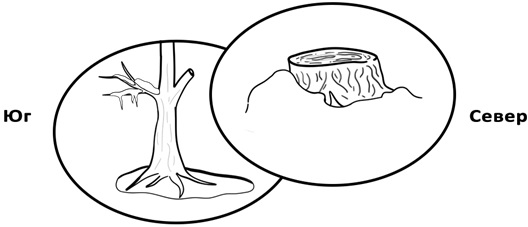 У сосны, у комля, ближе к корням, нередко обильно нарастает мох, лишайники. Мох любит сырость, тень, норовит спрятаться от прямых солнечных лучей за стволом и, значит, указывает на север. Точно так же мох располагается на отдельных камнях, пнях, на скалах, на стенах старых деревянных и каменных строений. Из лиственных деревьев мхом и лишайниками больше всего обрастают осины и тополя. В случаях, когда ствол дерева покрыт разросшимся лишайником вкруговую, надо ощупать его рукой. С северной стороны лишайник более влажный, плотный, его больше. Засохшие деревья, пни, упавшие на землю стволы в большей степени гниют с северной стороны (рис. 19).